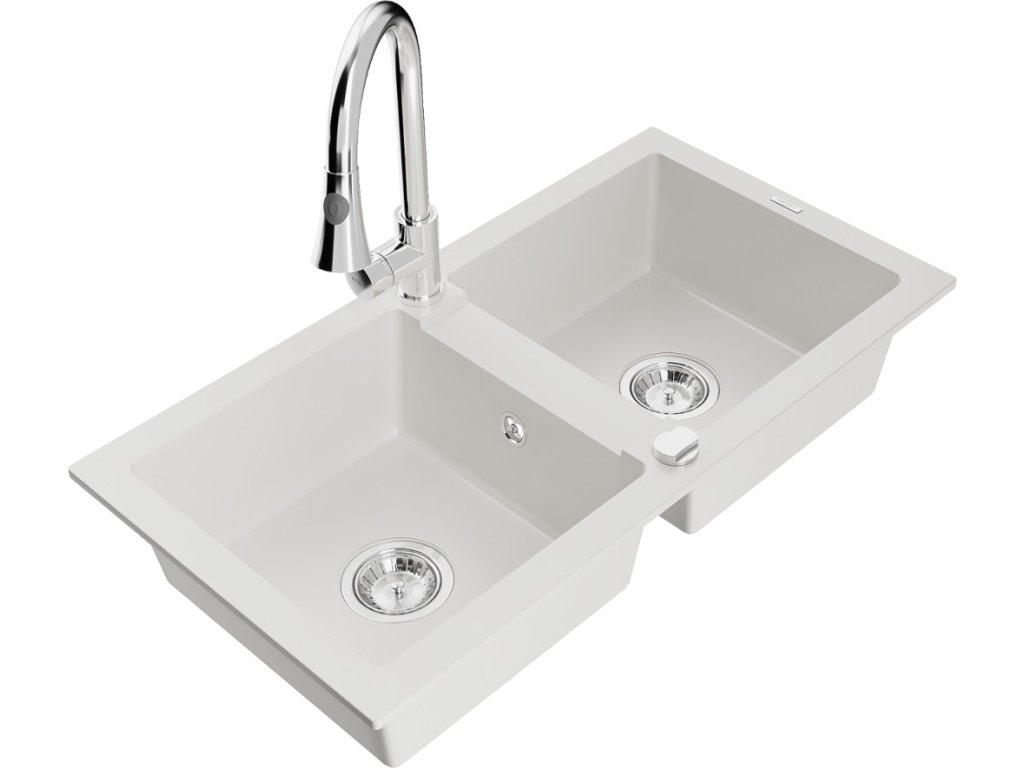 MEXEN/S - Mario granitový dřez 2-bowl včetně baterie Elia, bílá 6504-20-670101-00