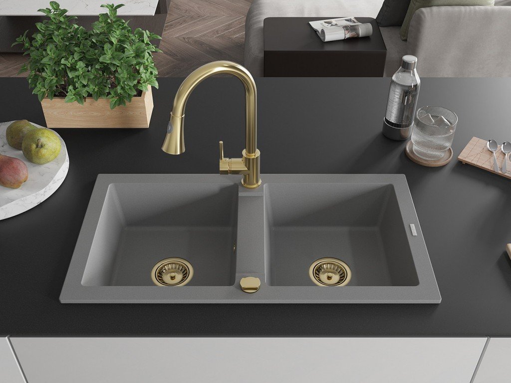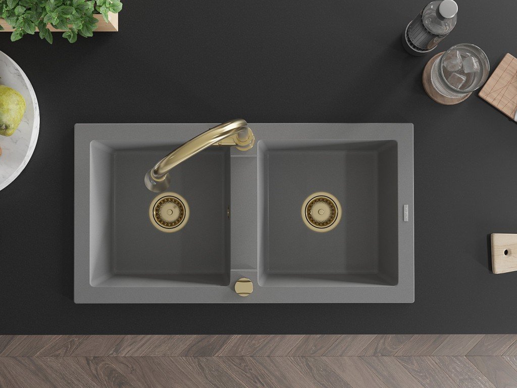 MEXEN/S - Mario granitový dřez 2-bowl včetně baterie Elia, šedá 6504-71-670101-50