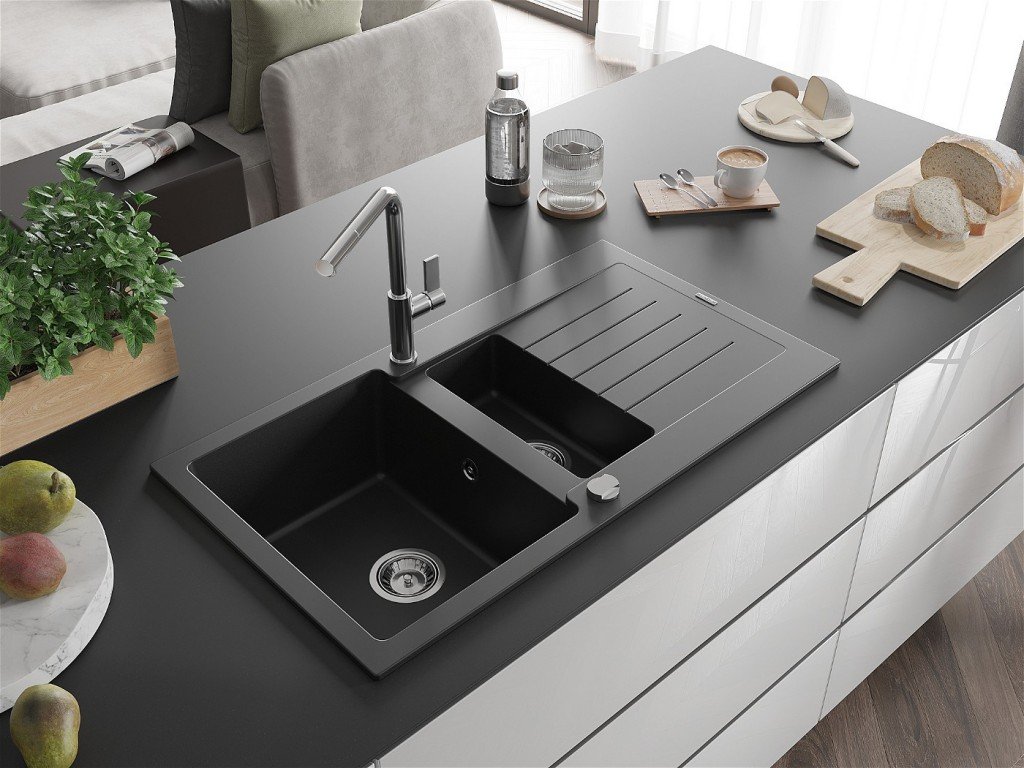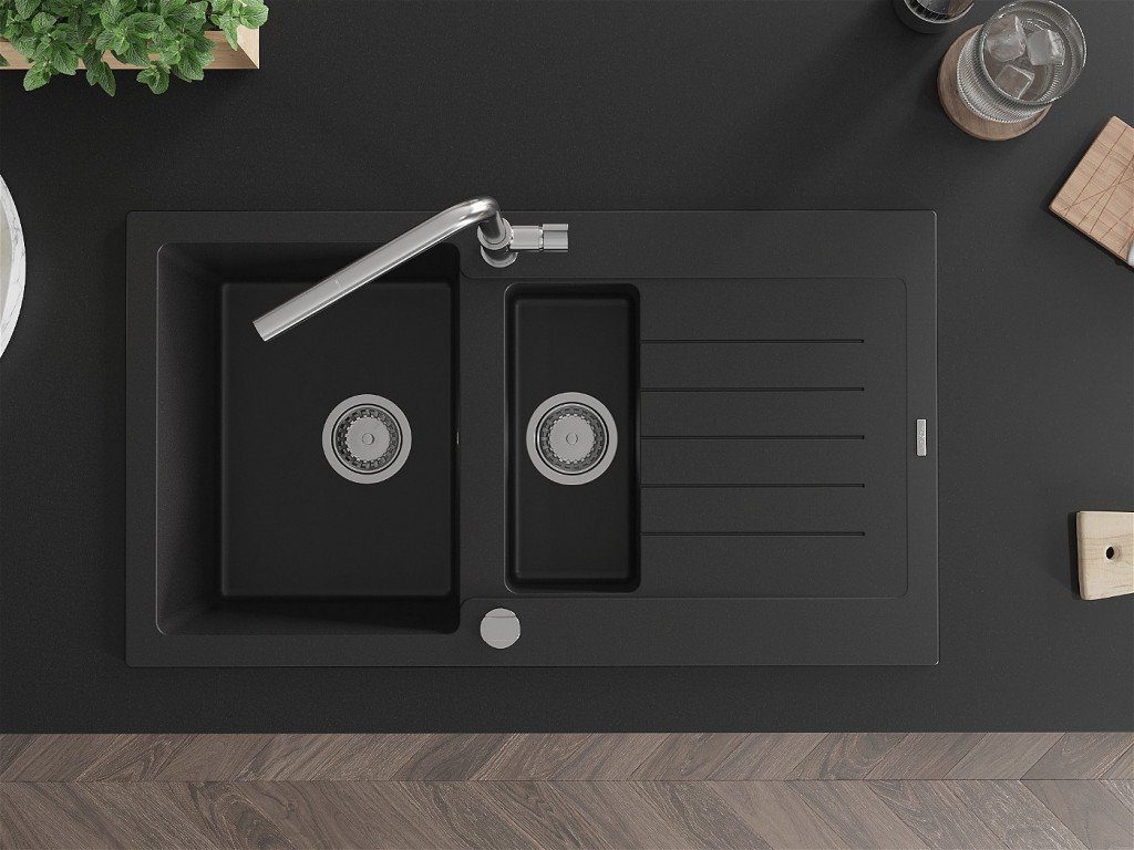 MEXEN/S - Matias granitový dřez 1.5 s odkapávačem včetně baterie Flora, černá 6502-77-670401-00