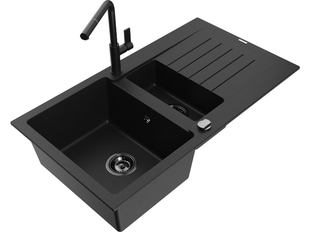 MEXEN/S - Matias granitový dřez 1.5 s odkapávačem včetně baterie Flora, černá 6502-77-670401-70-B