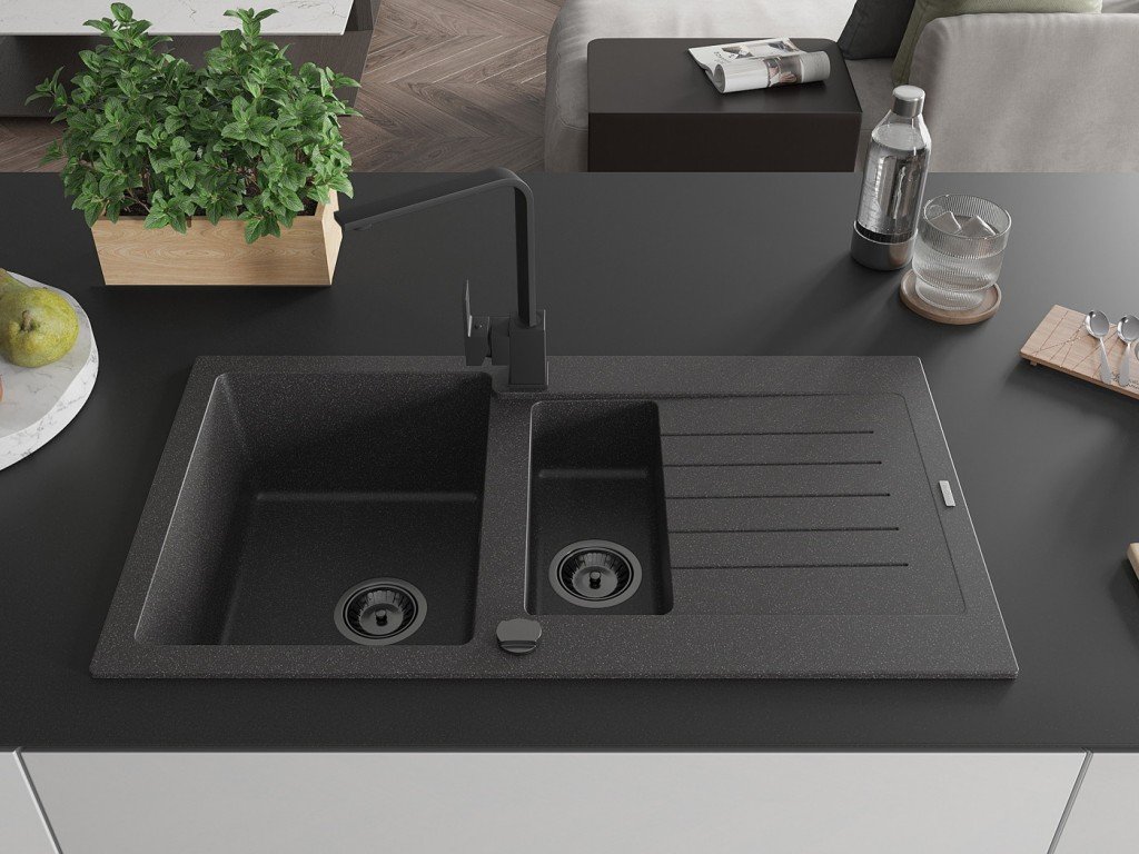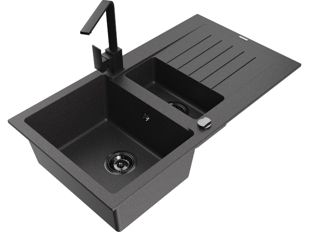MEXEN/S - Matias granitový dřez 1.5 s odkapávačem včetně baterie Rita, černý kropenatý 6502-76-670300-70-B