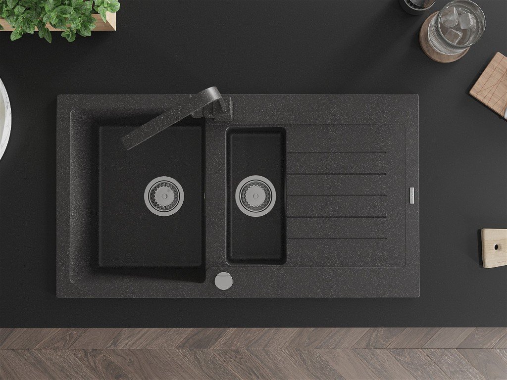 MEXEN/S - Matias granitový dřez 1.5 s odkapávačem včetně baterie Rita, černý kropenatý 6502-76-670300-76