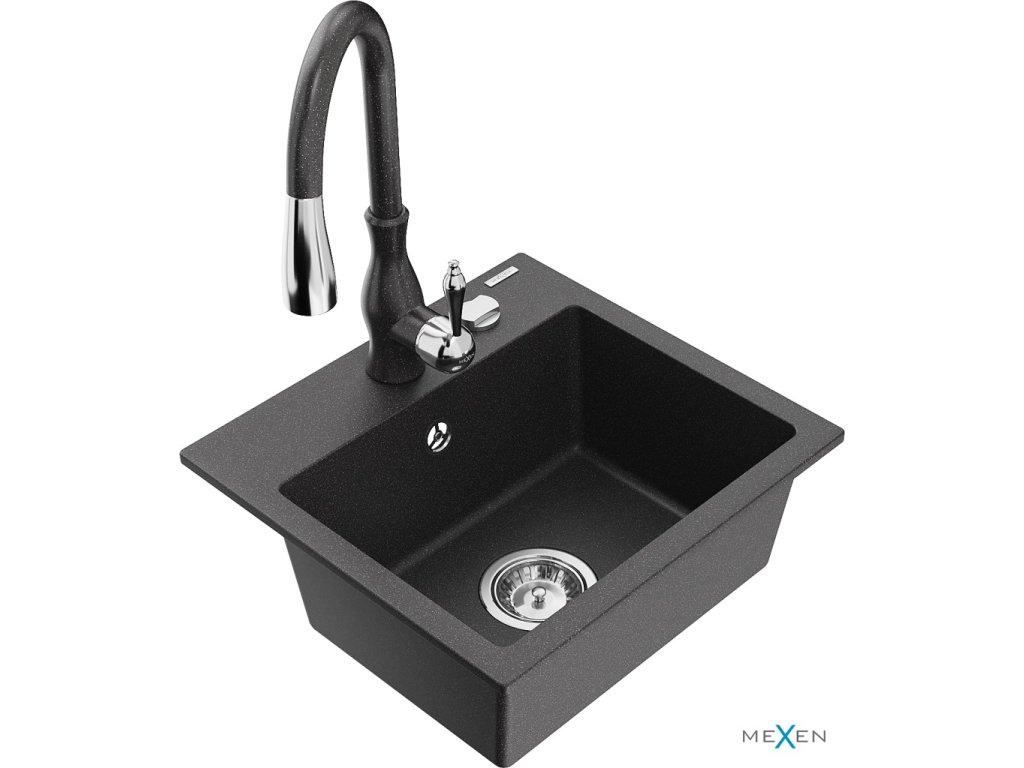 MEXEN/S - Milo granitový dřez 1-miska včetně baterie Savita, černá kropenatá 6505-76-672601-76