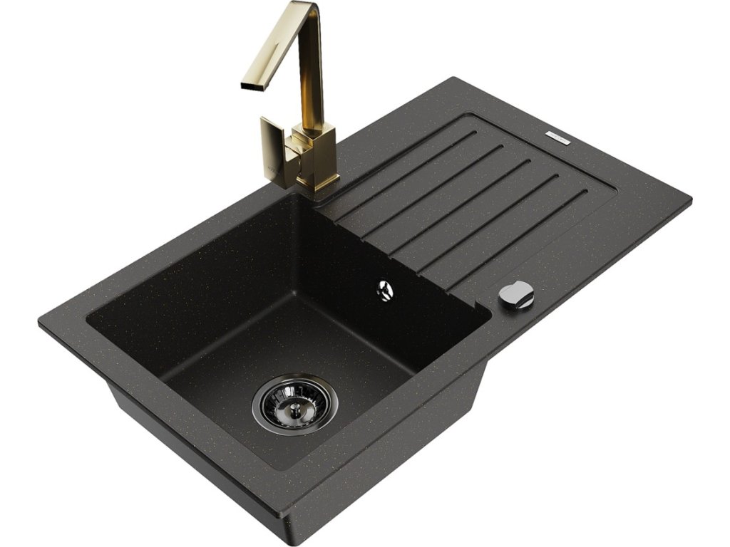MEXEN/S - Pablo granitový dřez 1-miska s odkapávačem včetně baterie Rita, černý/zlatý metali 6510-75-670300-50-B