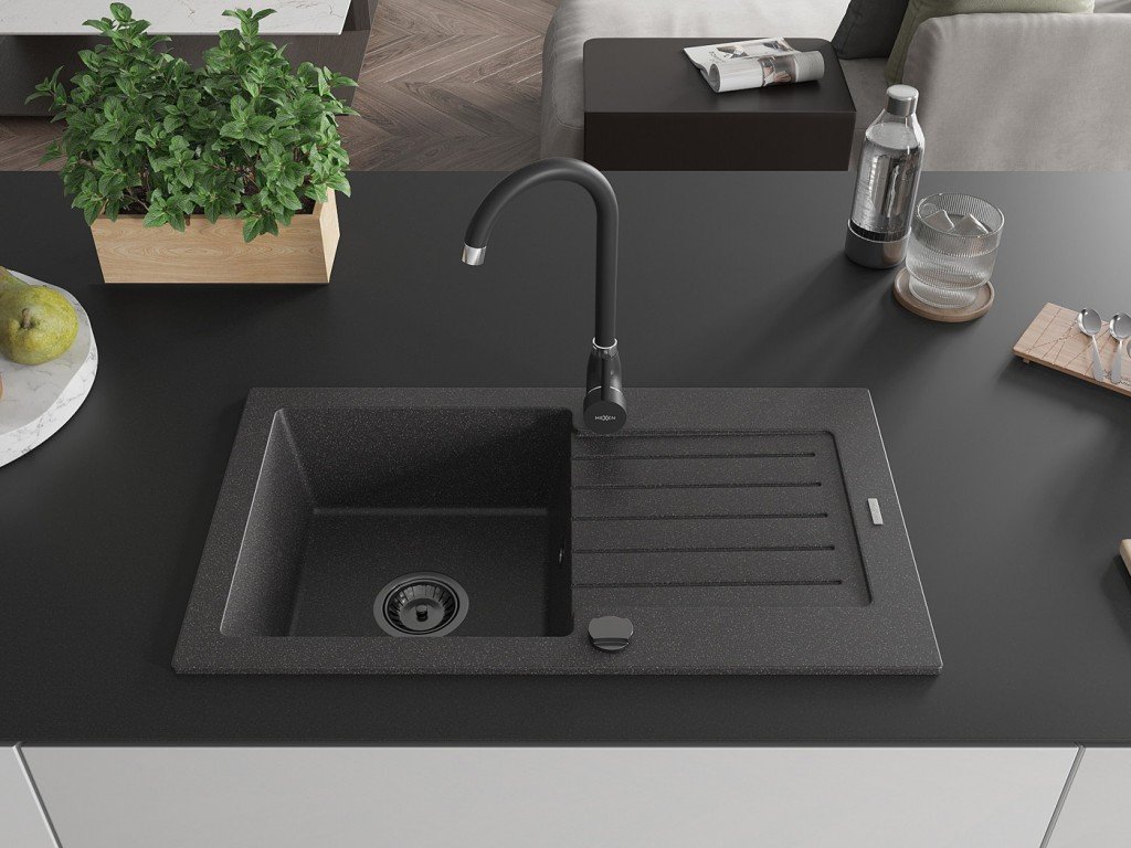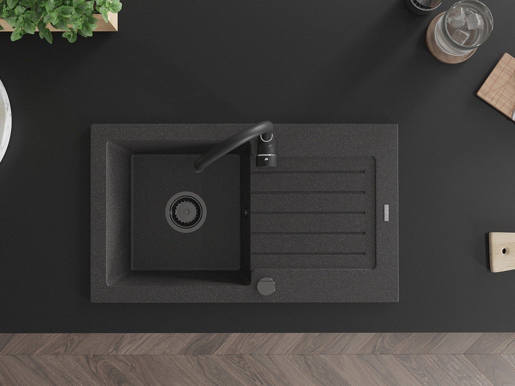 MEXEN/S - Bruno granitový dřez s odkapávačem včetně baterie Aster, černá/stříbrná metalik 6513-73-73450-57-B