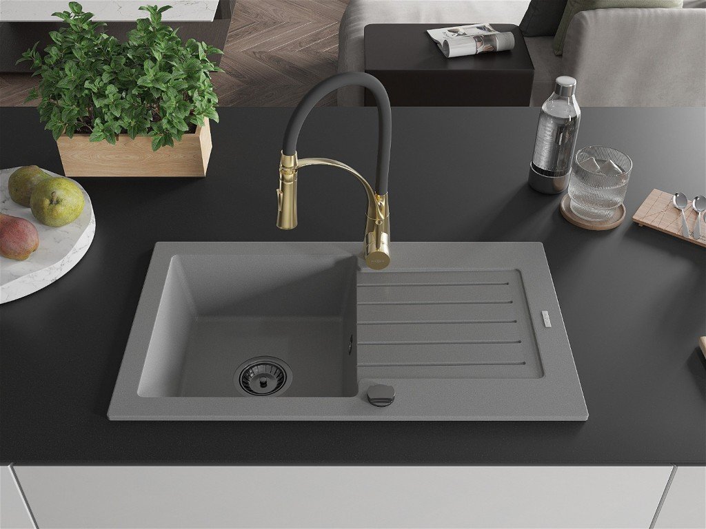 MEXEN/S - Pablo granitový dřez 1 s odkapávačem včetně baterie Aster, šedá 6510-71-73450-57-B