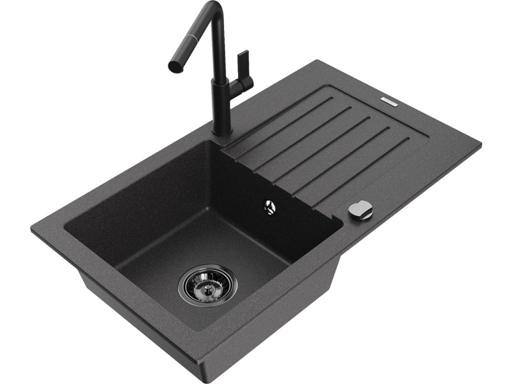 MEXEN/S - Pablo granitový dřez 1 s odkapávačem včetně baterie Flora, černá kropenatá 6510-76-670401-70-B