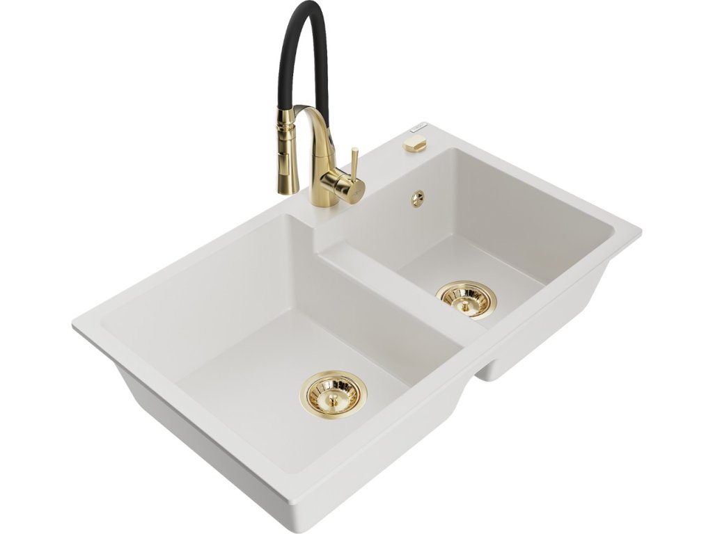 MEXEN/S - Tomas granitový dřez 2-bowl včetně baterie Aster, bílá 6516-20-73450-57-G
