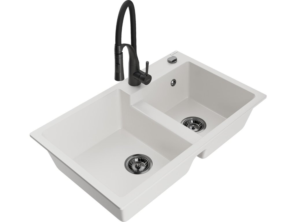 MEXEN/S - Tomas granitový dřez 2-bowl včetně baterie Aster, bílá 6516-20-73450-70-B