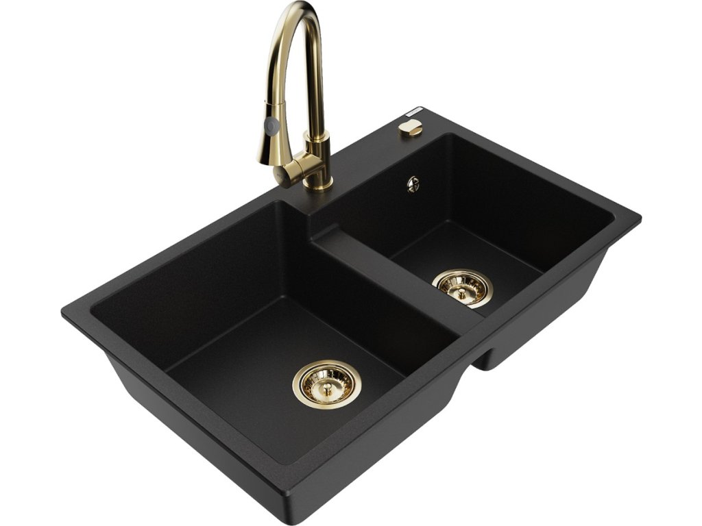 MEXEN/S - Tomas granitový dřez 2-bowl včetně baterie Elia, černá 6516-77-670101-50