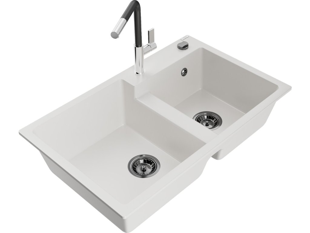 MEXEN/S - Tomas granitový dřez 2-bowl včetně baterie Flora, bílá 6516-20-670401-07-B