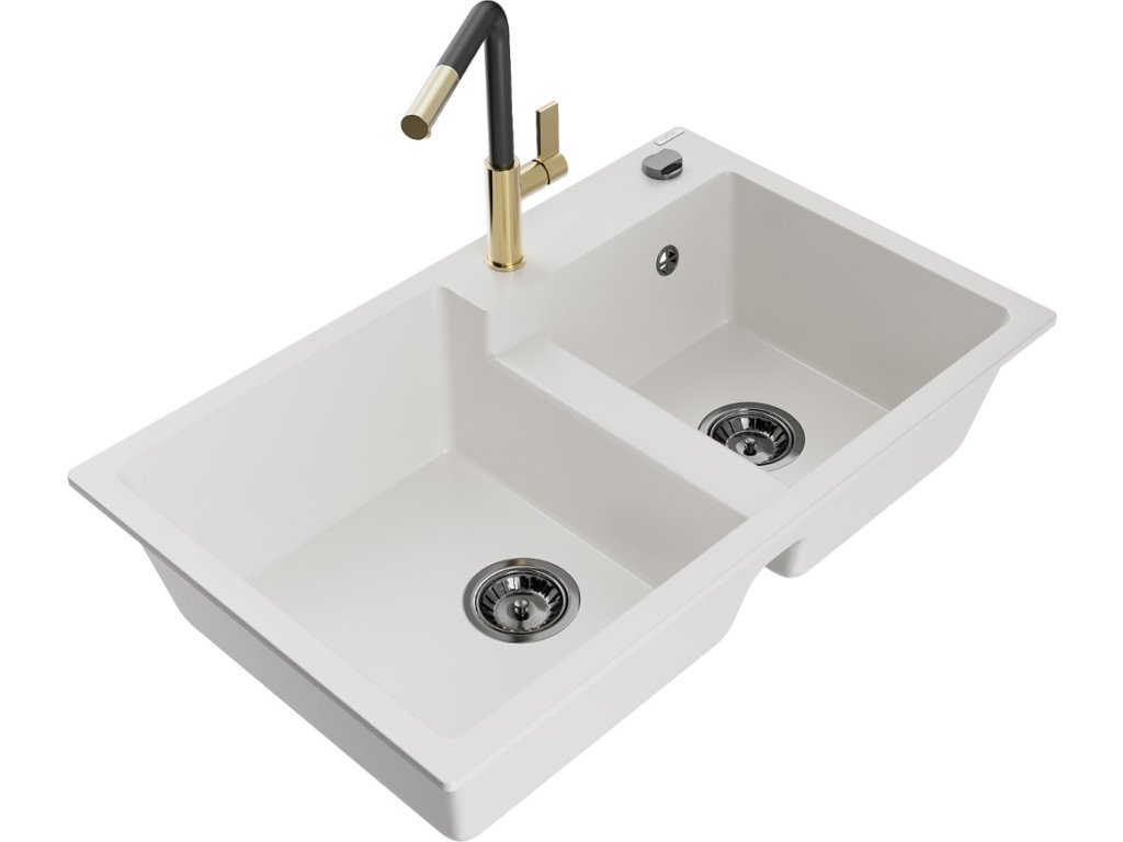 MEXEN/S - Tomas granitový dřez 2-bowl včetně baterie Flora, bílá 6516-20-670401-57-B