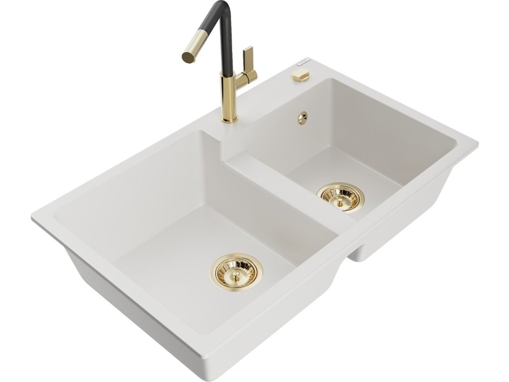 MEXEN/S - Tomas granitový dřez 2-bowl včetně baterie Flora, bílá 6516-20-670401-57-G