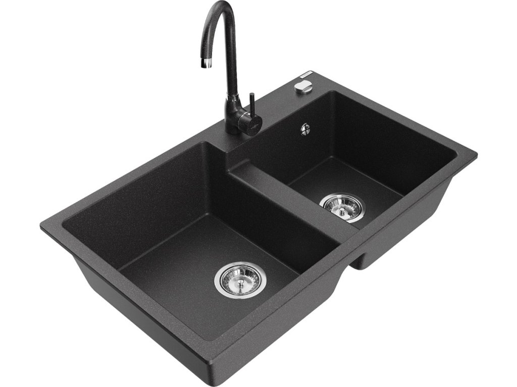 MEXEN/S - Tomas granitový dřez 2-bowl včetně baterie Telma, černá kropenatá 6516-76-670200-76