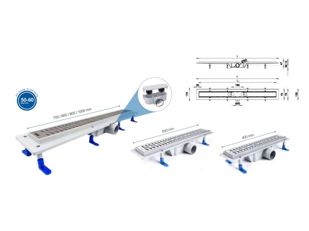 Odtokový žľab MEDIUM - 700: ROZMER A roštu 70 cm, dĺžka žľabu 76 cm