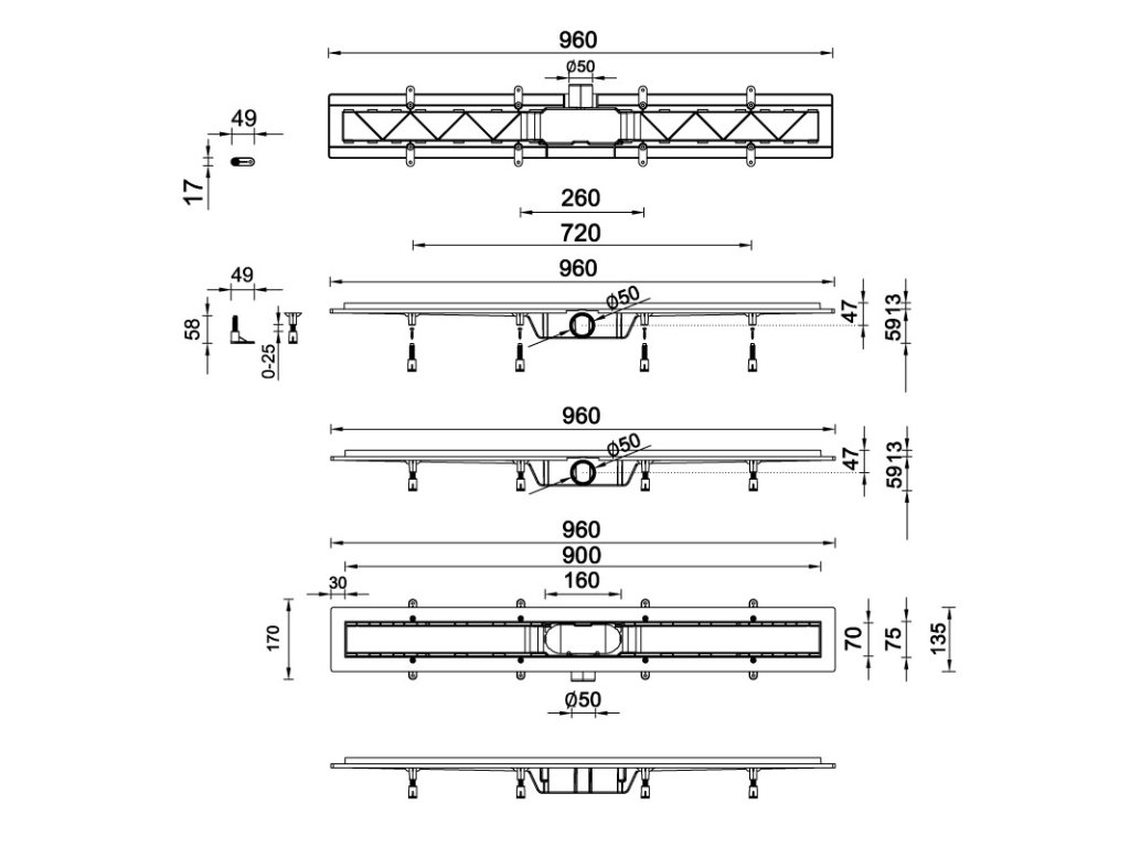 Odtokový žľab KLASSZIK - 900: ROZMER A roštu 90 cm, dĺžka žľabu 96 cm (možnosť vloženia dlažby)