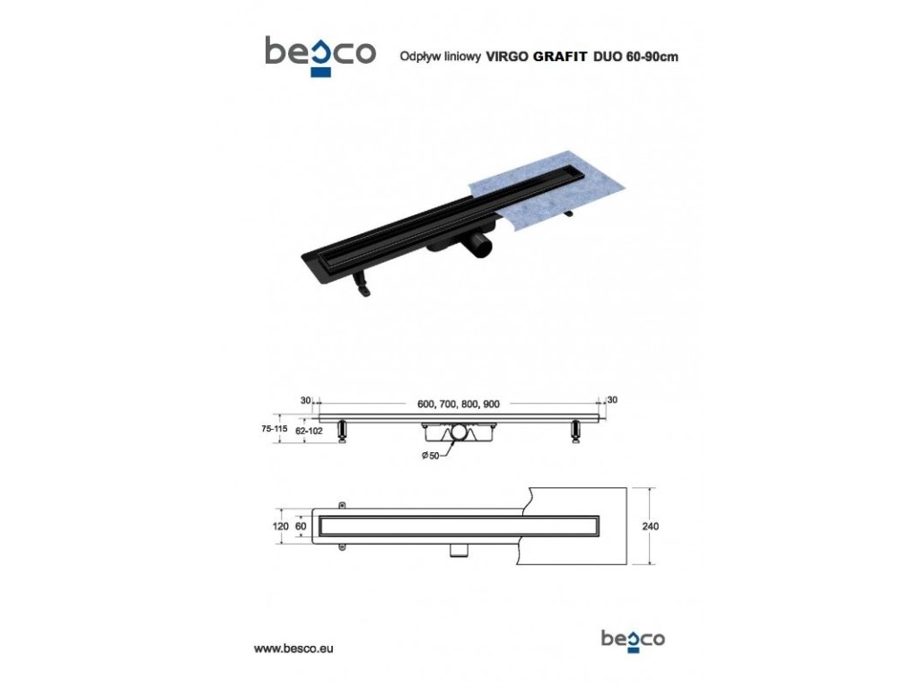 Kvalitne a moderne spracovaný odtokový žľab. Telo žľabu aj vlastný rast je vyrobený z veľmi kvalitnej nereze a sú oba s povrchovou úpravou v grafitovej farbe . Rošt je možné použiť buď na vloženie dlažby , alebo ako pohľadový (grafitová farba). Tento žľab obohatí každú kúpeľňu o nádych luxusu. Sada obsahuje: žľab so sifónom a nožičkami, rošt a hydroizolačnú pásku.