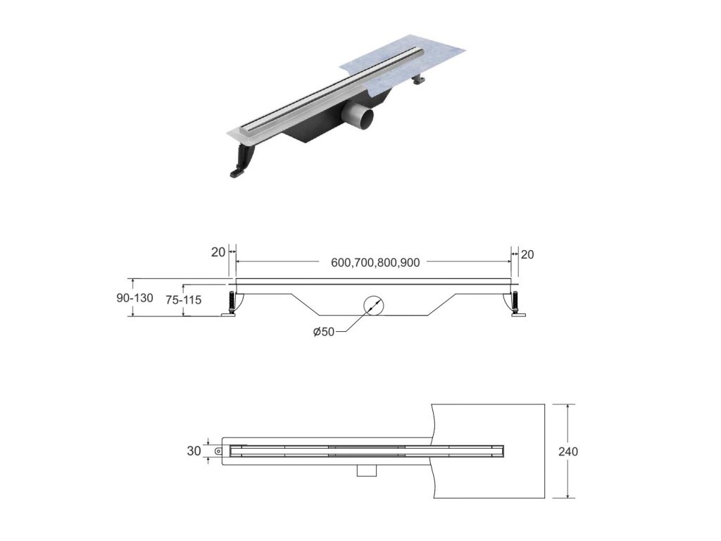 Odtokový žľab VIRGO SLIM-90: dĺžka roštu 90 cm, dĺžka žľabu 94 cm