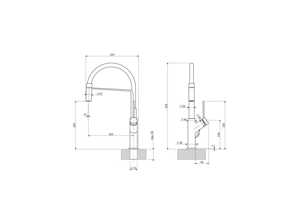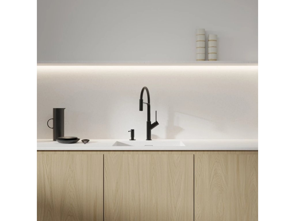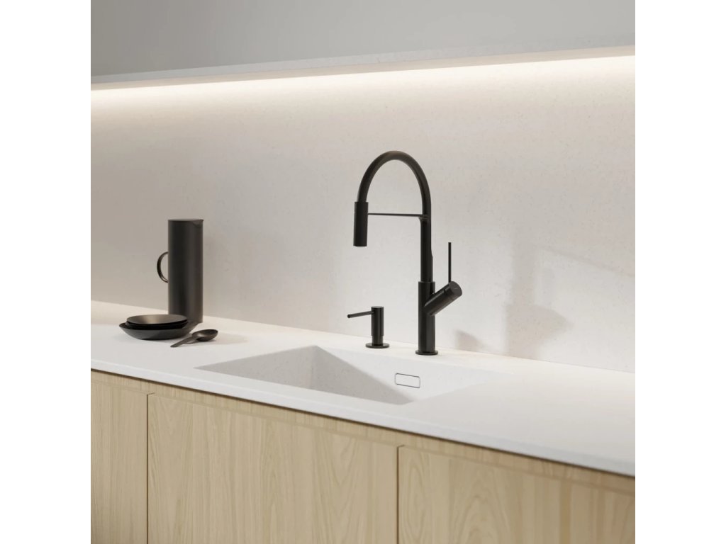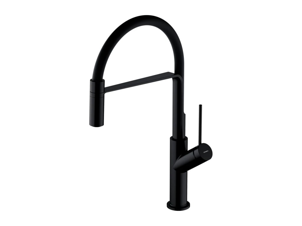 Kuchyňská baterie OMNIRES VITA je kombinací dokonalé formy a nejvyšší funkčnosti. Moderní, minimalistický design je založen na tvarech oblouku a kruhu. Otočný výtok vybavený sprchou lze dodatečně odejmout, díky čemuž se proud vody snadno dostane na jakékoli místo. Horní část hubice je vyrobena z pružné černé gumy. Celková výška baterie je 44 cm, což zvyšuje komfort používání. Baterie je vyrobena z kvalitní mosazi a opatřena nejkvalitnější keramickou kartuší. Inovativní technologická řešení umožňují snížit spotřebu vody na polovinu a zajistit nejvyšší komfort používání.