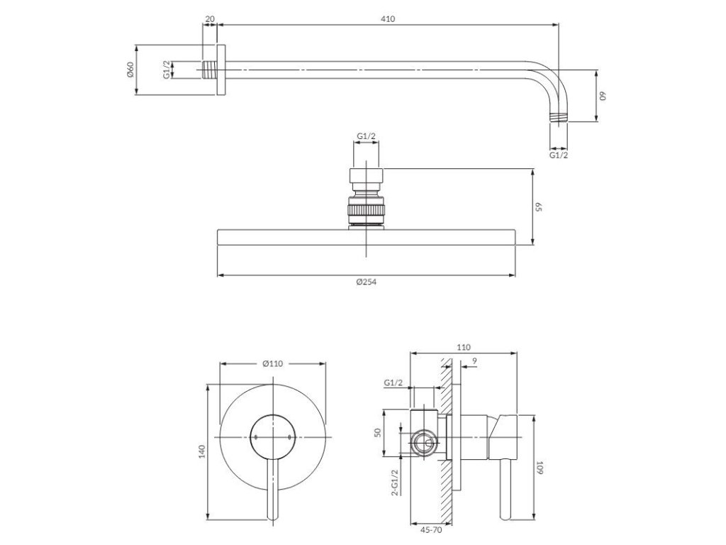 - mosazná sprchová hlavice s ramenem (WGSET1CR), rozměry: ø25 cm, dosah od stěny: 41 cm