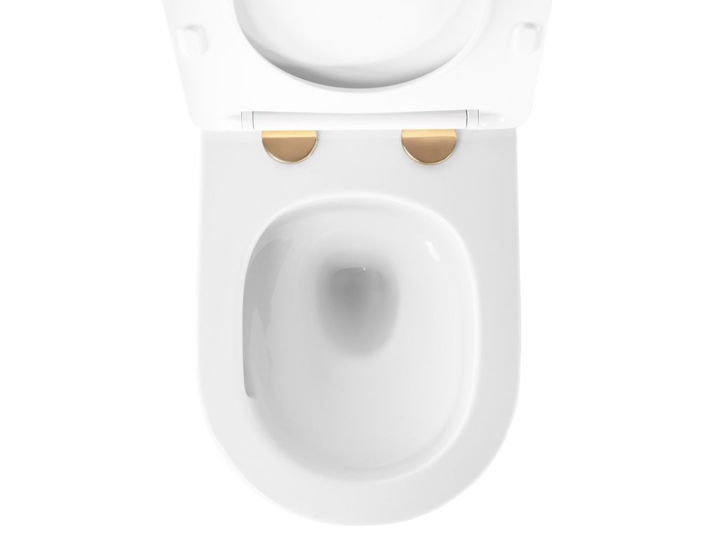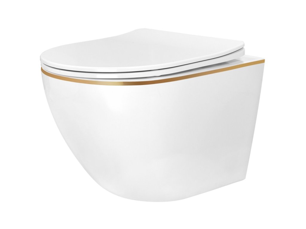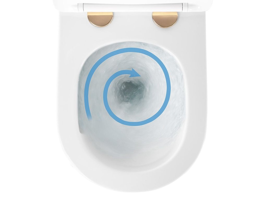 Bezokrajová závěsná WC mísa, bílá se zlatým okrajem a inovativním splachovacím systémem Tornado je moderním řešením, které kombinuje eleganci, snadné čištění a účinnost splachování. Bezrámový design nejen dodává moderní nádech, ale také usnadňuje udržování okolí mísy v čistotě. Tornado System: Díky pokročilému splachovacímu systému Tornado stéká voda vířivým pohybem dolů a účinně tak opláchne celý povrch mísy. To zajišťuje nejen důkladné opláchnutí, ale také minimalizuje usazování nečistot, což přispívá k hygieně. Miska je vhodná pro většinu podomítkových rámů Geberit, Grohe, Sanit, Rea.Dodatočné parametre