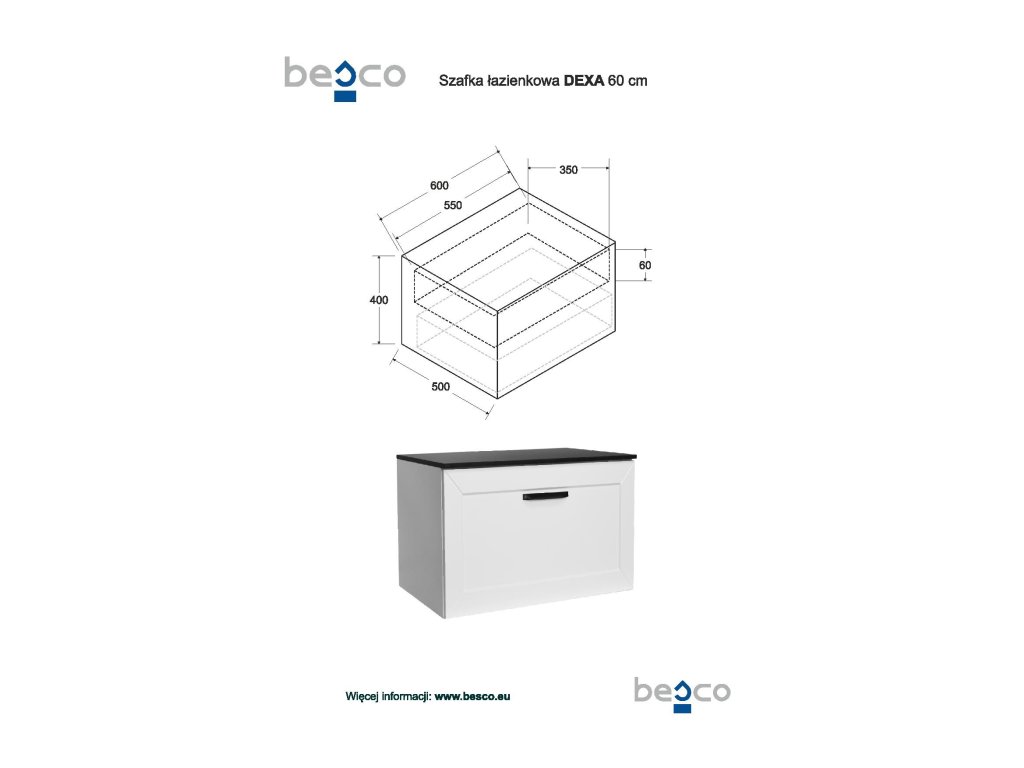 Populárny elegantný dizajn , široká farebná škála (štyri farebné varianty - biela matná, modrá matná, zelená matná a čierna matná), kvalitné spracovanie a moderné frézovanie na čele šuplíka, to je naša nová séria DEXA . Súčasťou dvierok je aj značkový tlmič dorazov pre tzv. tiché dovieranie (soft-close) . Nábytok dodávame v zmontovanom stave. K spodnej skrinke si musíte doobjednať hornú dosku pod umývadlo, ktorú je možné objednať v dvoch farebných variantoch (čierna a mramor).