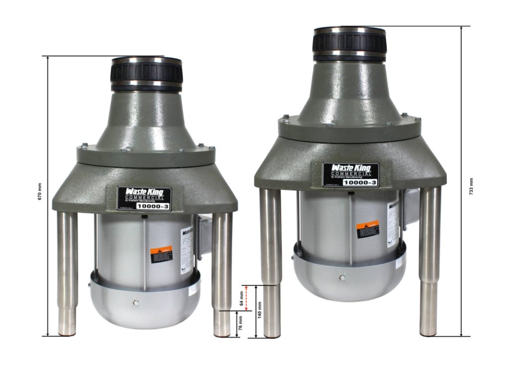 Gastro drvička Waste King 10000 je samostojná, stojí na troch výškovo nastaviteľných nôžkach. Napojenie na drez je z materiálu, ktorý tlmí vibrácie a hluk vznikajúci pri drvení. Drvič je možné ovládať pomocou pneumatického či kolískového spínača v závislosti na inštalácii.
