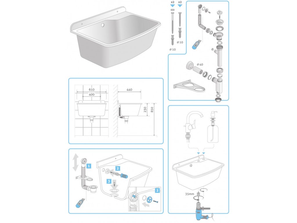Drez Maximus 610 môže byť montovaný k stene , teda nie je potreba pracovnej dosky. Drez je možné umiestniť aj do kuchynskej linky (horná montáž). Je možné tiež odvŕtanie otvorov pre batériu a dávkovač saponátu či mydla s priemerom 35 mm. Súčasťou balenia sú montážne skrutky, sifón, prepad, výpusť, zátka a odbočka na umývačku.